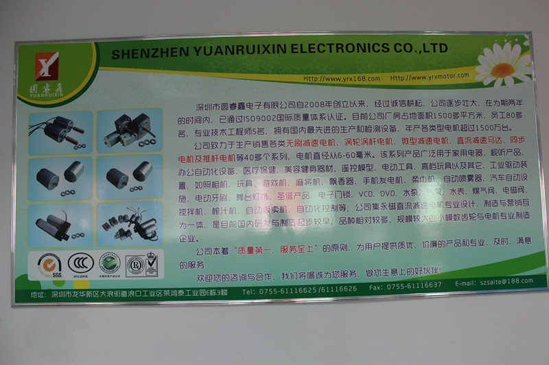 深圳市圓睿鑫電子有限公司自2008年創(chuàng)立以來,經(jīng)過誠(chéng)信耕耘,在為期兩年的時(shí)間內(nèi),已通過ISO9001:2000國(guó)際質(zhì)量體系認(rèn)證。公司廠房占地面積2000多平方米,員工100人,專業(yè)技術(shù)工程師6名,擁有國(guó)內(nèi)最先進(jìn)的生產(chǎn)和檢測(cè)設(shè)備,年產(chǎn)各類減速電機(jī)超過2~300萬(wàn)臺(tái)。因公司發(fā)展需要,于2020年底,將生產(chǎn)基地遷往擁有最美小鎮(zhèn)之稱的東莞市清溪鎮(zhèn),依山傍水,依托美麗的大自然環(huán)境和地方文化,全新的東莞市圓睿鑫電子有限公司將借助深圳母公司平臺(tái),一步步走上新的臺(tái)階。 東莞公司將繼續(xù)致力于生產(chǎn)銷售各類無刷減速電機(jī) 渦輪渦桿電機(jī),微型減速電機(jī),直流減速馬達(dá),交流手搖發(fā)電機(jī)、同步電機(jī)及空心杯電機(jī)等,電機(jī)直徑從6-60毫米為定位,系列產(chǎn)品廣泛用于智能家電、智能辦公自動(dòng)化設(shè)備、智能醫(yī)療、美容健身器材、遙控模型、電動(dòng)工具、高檔玩具以及其它工業(yè)驅(qū)動(dòng)裝置,如高檔玩具、游戲機(jī)、麻將機(jī)、飄香器、手機(jī)發(fā)電機(jī)、柔巾機(jī)、自動(dòng)噴霧器、汽車自動(dòng)設(shè)施、電動(dòng)牙刷、舞臺(tái)燈飾、圣誕產(chǎn)品、智能電子門鎖、VCD、DVD、水泵、氣泵、水表、煤氣閥、電磁閥、攪拌機(jī)、榨汁...